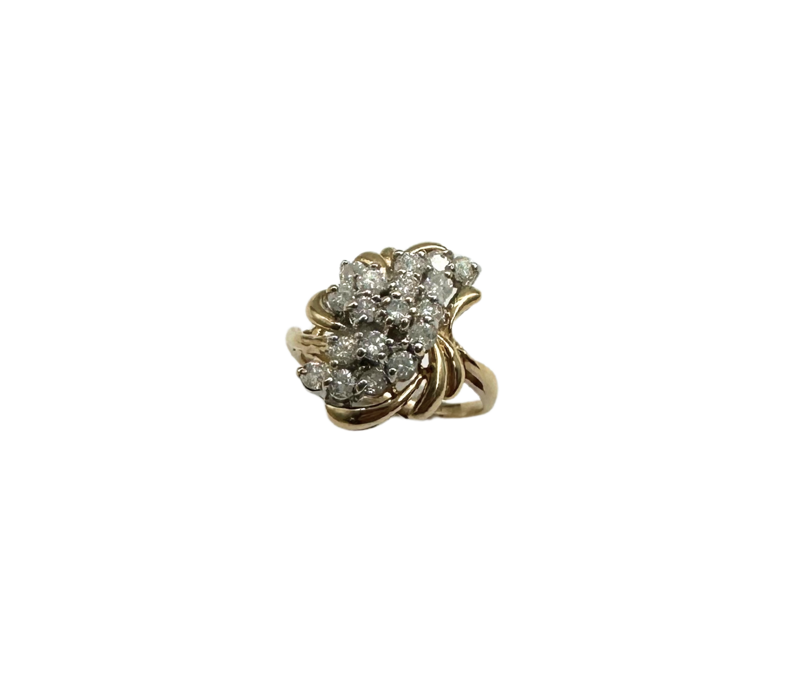 Make a statement with this breathtaking 14K yellow gold waterfall ring, adorned with 1.5 carats of dazzling diamonds. The cascading design creates a striking display of brilliance, capturing light from every angle. Weighing 5.8 grams and sized at 7, this ring is both elegant and bold, perfect for adding a touch of glamour to any collection. Whether worn as a statement piece or a timeless treasure, this ring is sure to turn heads.