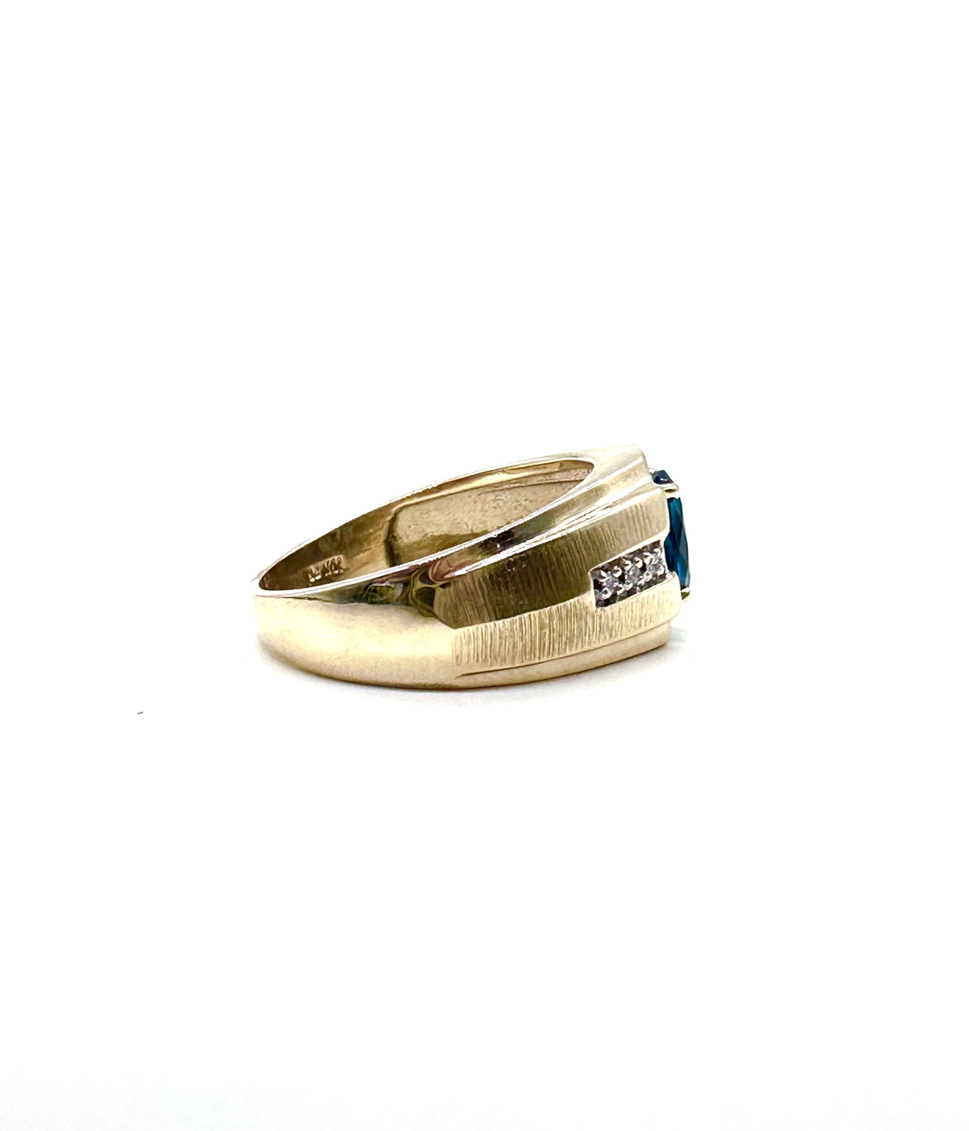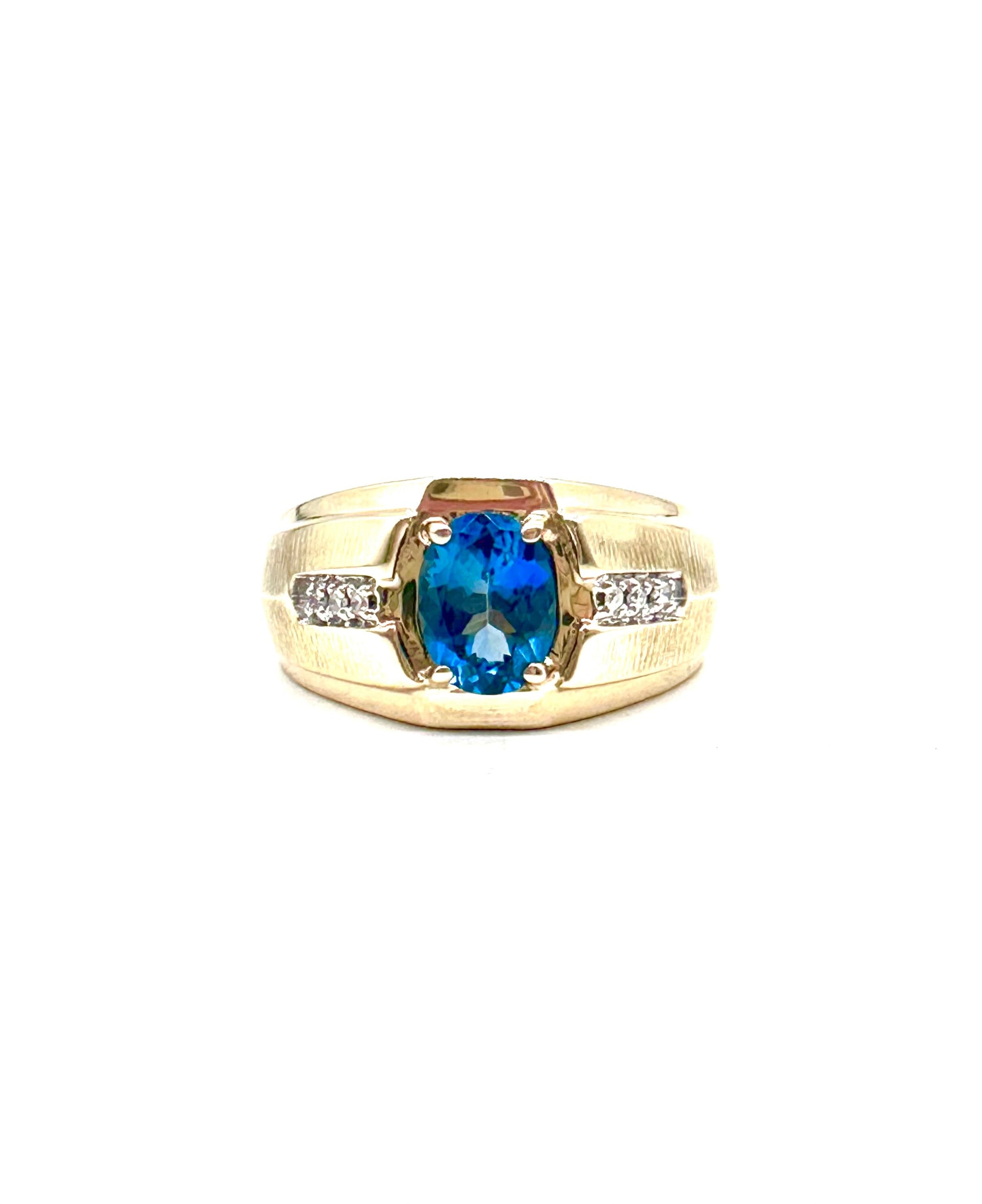 This handsome men’s blue topaz and diamond ring is set in 10 karat yellow gold.